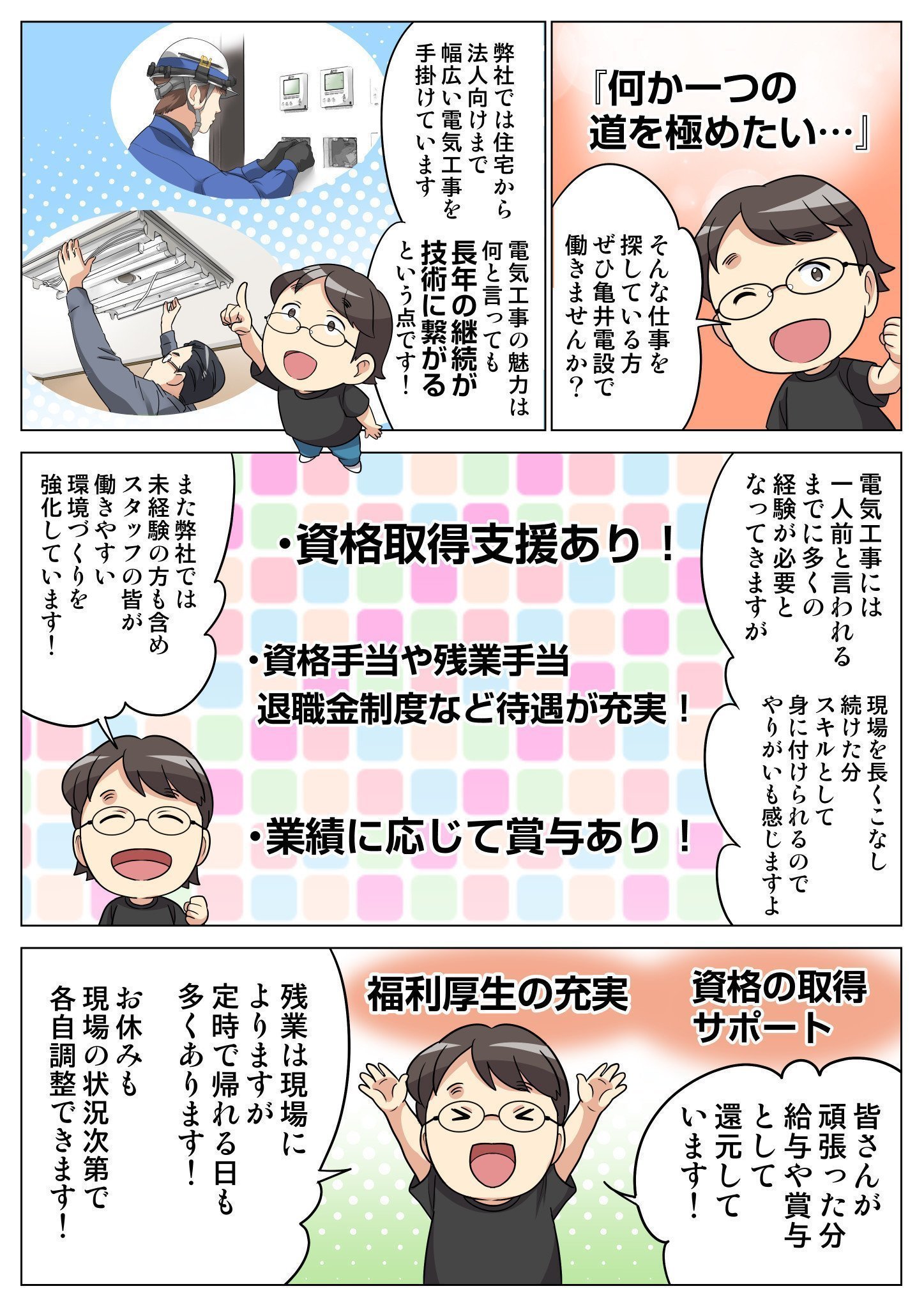 有限会社亀井電設では、電気工事を担当してくださるスタッフを随時募集中です。高い技術が身につくことはもとより、全社員が働きやすい環境作りにも力を入れています。弊社で一緒に働いてみませんか?